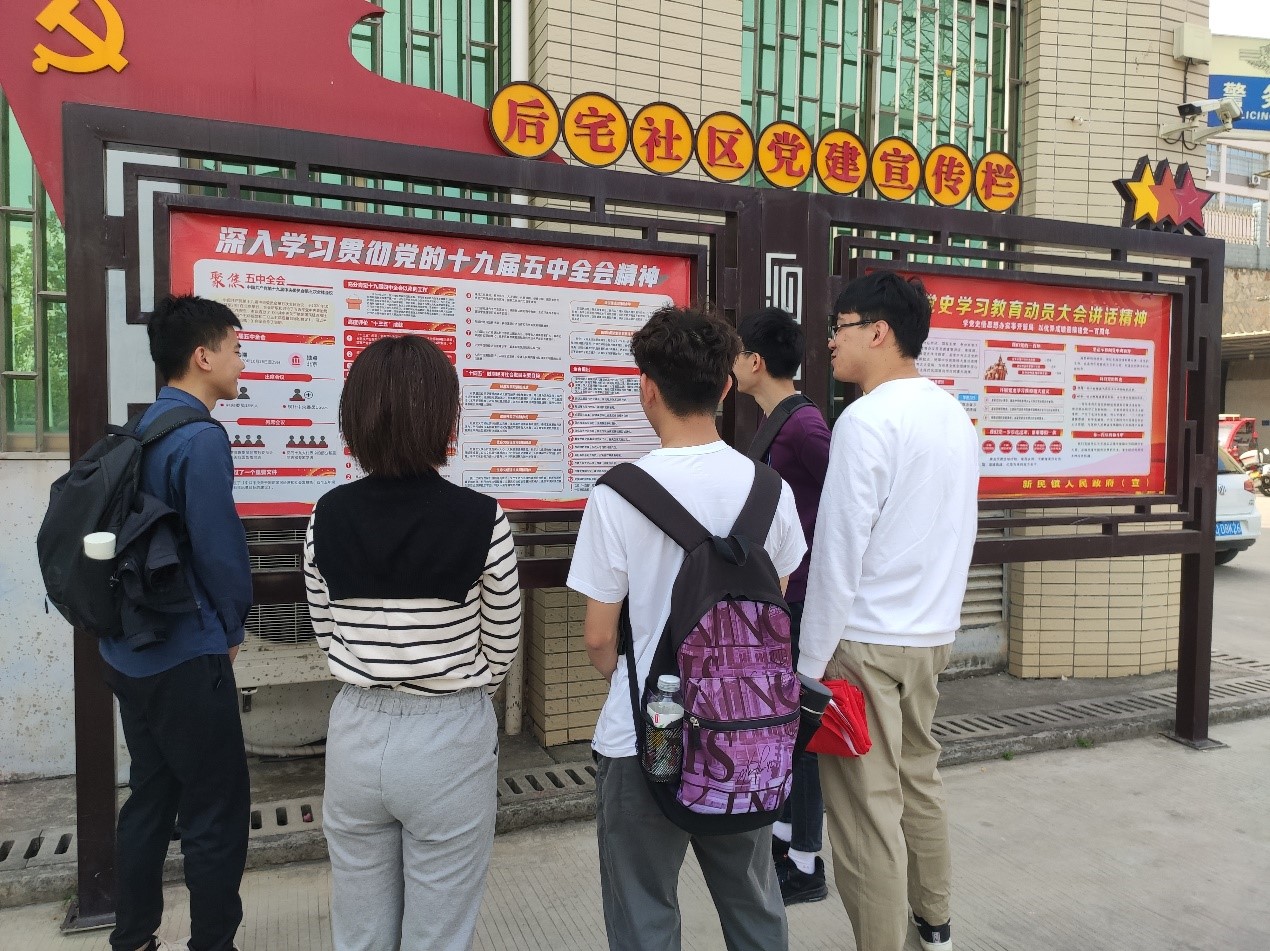 紧接着,成员们缓缓步入基地村内部,眼前一幢巨大的高楼就是后宅社区党群活动服务中心,由此可以深切体会到当地支部为发扬老一辈革命家的光荣传统,传承红色基因所作出的努力。我们发现,此处党建宣传栏相当完备且丰富,它向我们展示了深入学习贯彻党的十九届五中全会精神和党史学习教育动员大会讲话精神。为此,党支部书记王经瑶说:“2021年时共产党发展历史上具有里程碑意义的一年,一百年来中国共产党筚路蓝缕,立下不朽基业,因此把握领会两会精神和党史都具有重大意义,它是我们新一代党员牢记初心使命、坚定信仰信念、永葆党的生机活力的必然要求。”