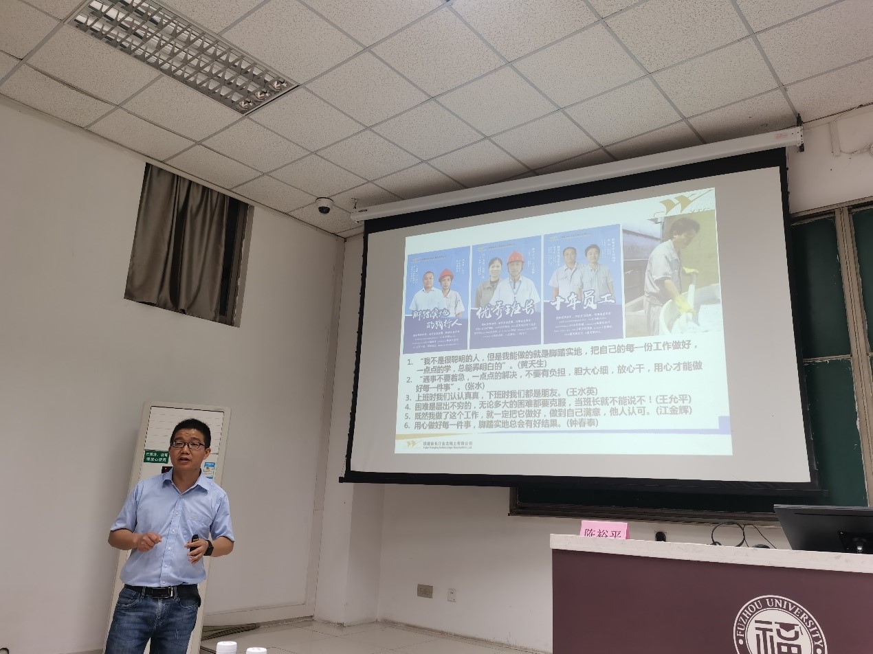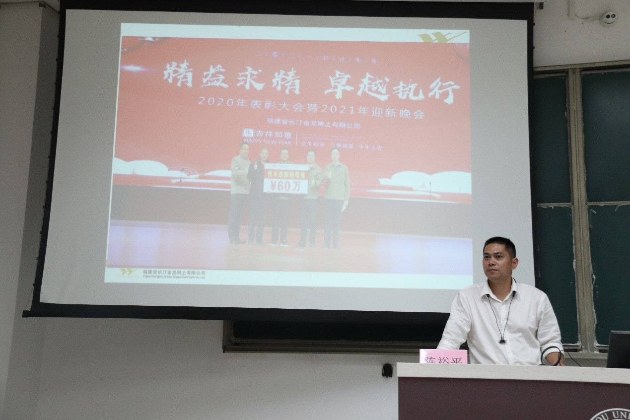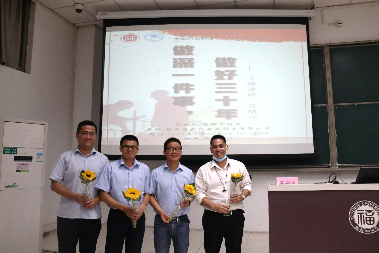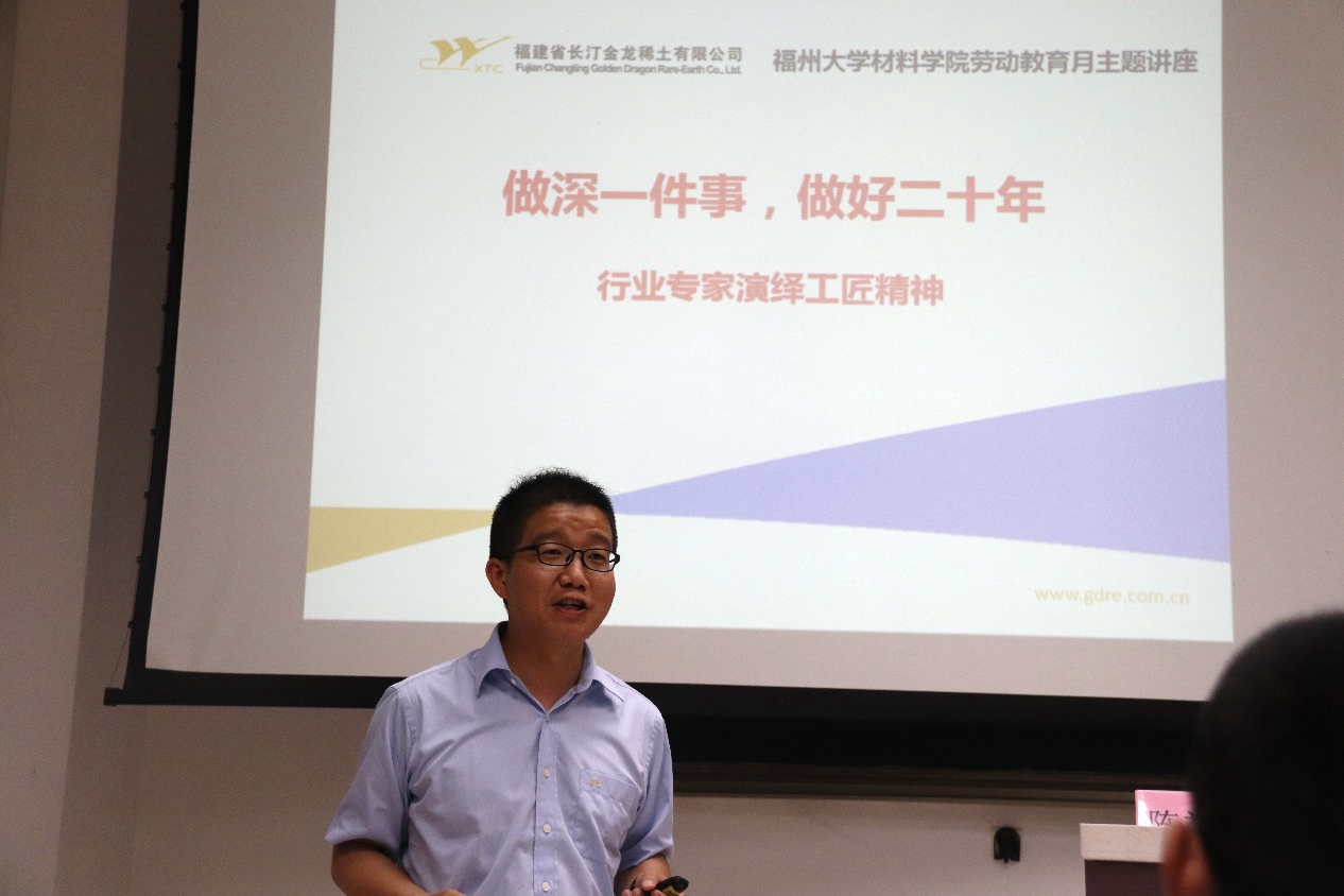为培养av在线看 学子对于新时代劳动的认识、感受劳动的光荣、激励av在线看 学子培养新时代劳动技能,5月31日,福建省长汀金龙稀土有限公司陈余水总监、张榕贵经理、陈裕平经理、黄世华经理进一行人进校做劳模演绎工匠精神“做深一件事,做好二十年”主题讲座。讲座由陈裕平经理主讲,辅导员王怡老师及近百人参与活动。