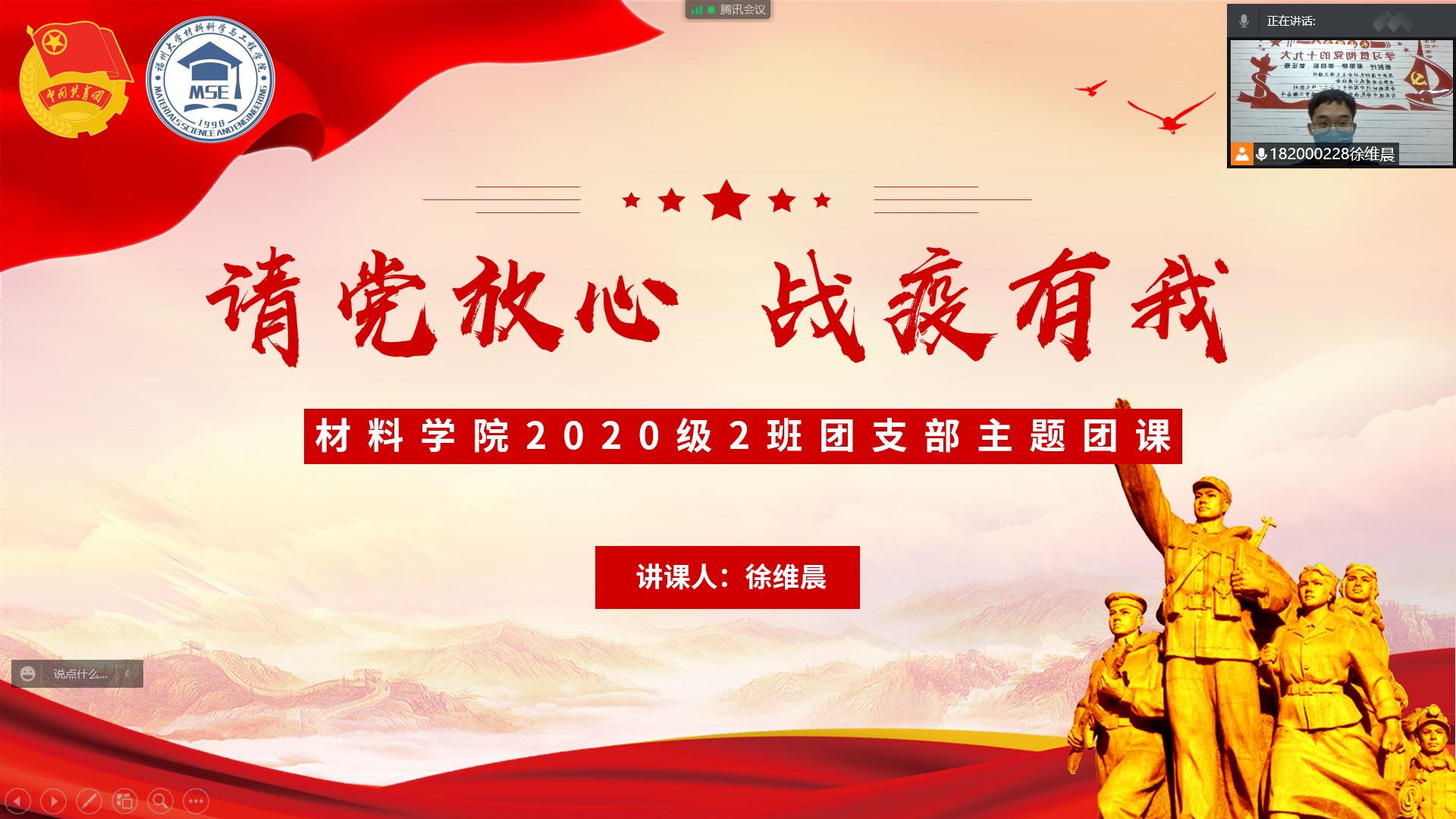 在av在线看 共青团抗击疫情专项行动之“团干部上讲台”讲好抗疫专题思政课的号召下,3月24日晚,av在线看 2020级2班团支部组织开展《请党放心,抗疫有我》线上团课。av在线看 2020级2班副团支书徐维晨担任本次团课主讲人,全体支部成员参与本次团课。